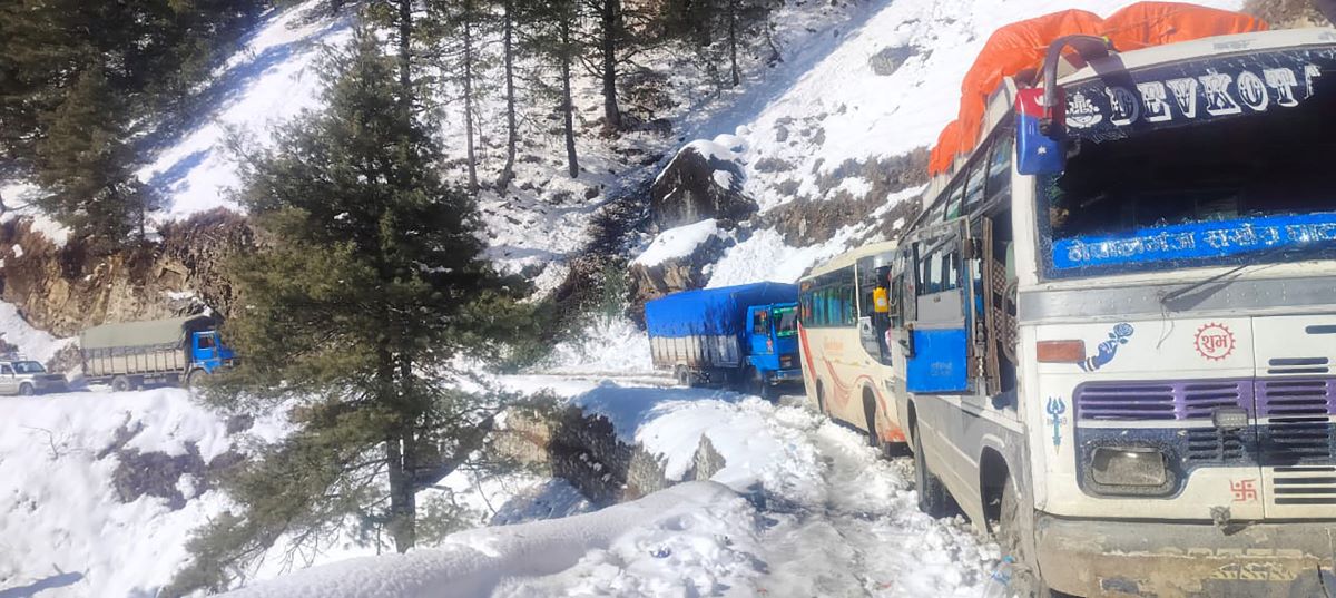 जुम्ला । बिहीबारदेखि परेको हिमपातका कारण अवरुद्ध नाग्म–गमगढी सडक अझै खुल्न सकेको छैन । सडक डिभिजन कार्यालय जुम्लाले एक्साभेटरको प्रयोग गरेर हिउँ पन्छाउन सुरु गरे पनि बाक्लो हिउँ परेकाले पन्छ्याउन समय लागेको जनाएको छ । बाक्लो हिउँ जमेको र कतै पहिरो त कतै विजुलीका पोल ढलेकाले सडक अवरुद्ध भएको छायाँनाथ रारा नगरपालिका वडा न ५…