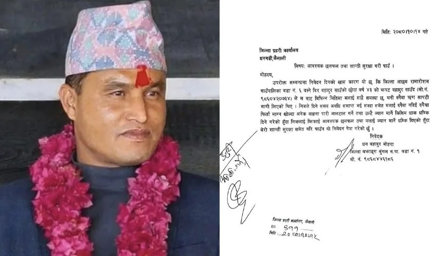 काठमाडौँ । सुदूरपश्चिम प्रदेशका सामाजिक विकास मन्त्री झपटबहादुर साउँदविरुद्ध उजुरी परेको छ । मंगलबार सुरक्षाको माग गर्दै बझाङको बुंगल नगरपालिका-१ का धनबहादुर बोहराले मन्त्री साउदविरुद्ध उजुरी दिएका हुन् । मन्त्री साउदले आफूलाई ज्यान मार्ने धम्की दिएको भन्दै बोहराले सोमबार जिल्ला प्रहरी कार्यालय कैलालीमा उजुरी दिएका छन् । उनको उजुरीमा भनिएको छ, ‘समस्या छ भनी रुपैयाँ…
